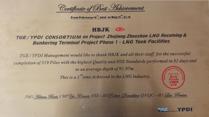 近日我公司收到TGE/YPDI的浙江舟山LNG儲罐接收站項(xiàng)目“最佳成績證書”牌匾,內(nèi)容:TGE/YPDI 管理層對2016年2月19日至2016年5月11日期間河北建勘及其員工以高質(zhì)量和嚴(yán)格的HSE管理標(biāo)準(zhǔn)在82天內(nèi)完成319根樁基且平均深度在91.07米的成績表示感謝。