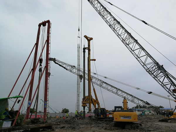 本項(xiàng)目施工高峰期投入150旋挖鉆機(jī)3臺(tái),GPS-10回轉(zhuǎn)鉆機(jī)5臺(tái),中方施工人員49人,緬方施工人員150人。本工程于2018年3月10日開(kāi)工,9月02日竣工,共計(jì)177天,完成9個(gè)罐,直徑600mm樁基1250根,理論方量10650m³。整個(gè)施工期正值緬甸雨季,我公司克服種種施工困難,最終安全順利完成了總包方各個(gè)節(jié)點(diǎn)工期目標(biāo)。