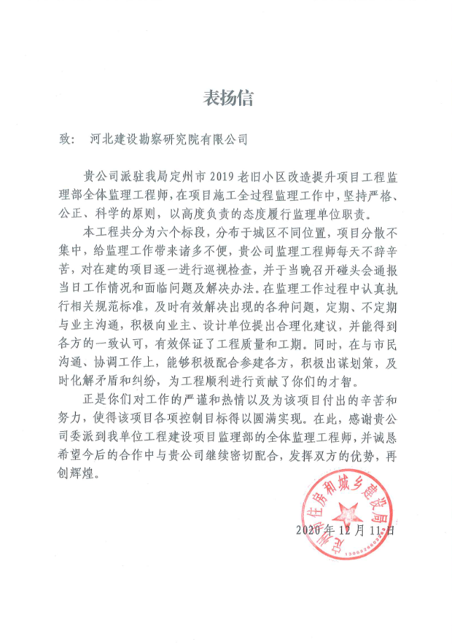 2020年12月我公司收到來自定州市住房和城鄉(xiāng)建設(shè)局關(guān)于定州市2019老舊小區(qū)改造提升項目監(jiān)理工程的表揚信,目前該項目已順利竣工驗收。雖然該項目要求時間緊、任務重,但在監(jiān)理過程中我們公司嚴格按照相關(guān)規(guī)范、標準,科學管理,嚴謹認真負責的工作作風,保證了該項目按期完工,給各方留下了深刻的印象,不僅得到了定州市住房和城鄉(xiāng)建設(shè)局的高度認可和贊譽,還贏得了周邊市民的一致好評,樹立了良好的口碑和信譽,為躋身定州建筑市場更好擴展業(yè)務奠定了基礎(chǔ)。