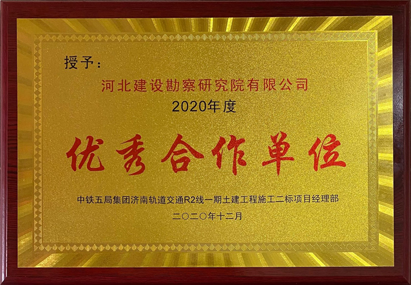 近日,由我公司承接的濟南軌道交通R2線施工監(jiān)測項目,榮獲中鐵五局集團濟南軌道交通R2線一期工程項目土建二標經(jīng)理部 “2020年度優(yōu)秀合作單位”和“郝迪培2020年度優(yōu)秀班組長”兩項榮譽獎牌。