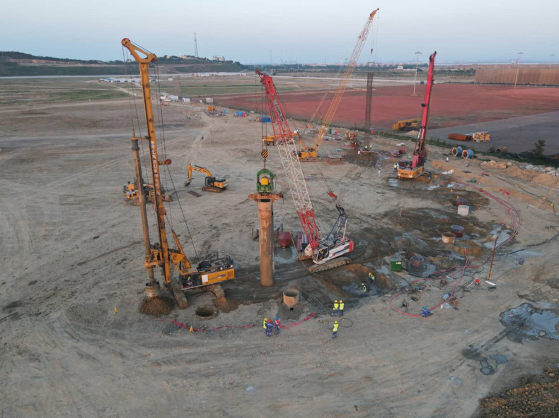 中海油龍口南山LNG接收站一期工程項目(以下簡稱“龍口LNG”)站址位于山東省龍口市煙臺港龍口港區(qū)作業(yè)區(qū)規(guī)劃LNG專區(qū),本工程于2020年4月15日開工,2021年4月1日竣工,歷時351天。完成的主要工作量為T-0201、T-0202儲罐樁基工程相關的全部工作,包含:泥漿護壁成孔一體化灌注樁(樁數(shù)720根,直徑1.5m,樁長為9.86m~41.8m不等,混凝土等級C40P8)40765.71m³、鋼筋籠3564.846t、入巖增加費10892.03m³、聲測管(SCG50-1)8601.59m、碎石樁(樁徑1m,樁長8m,樁數(shù)3497根)21972.3m³、旋挖棄土外運39358.86m³、預留隔震墊安裝孔洞(單樁孔洞數(shù)量10個,孔洞長度0.9m,孔徑80mm)720套,超前鉆5247.5m。