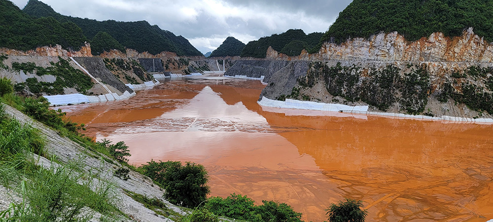 對尾礦庫來說防止?jié)B漏極其關(guān)鍵,此項目排泥庫庫區(qū)位于巖溶發(fā)育區(qū),巖溶治理是關(guān)鍵中的關(guān)鍵。庫周設(shè)計3座堆石壩,2座混凝土重力壩,壩體的施工質(zhì)量關(guān)系排泥庫的運行安全。