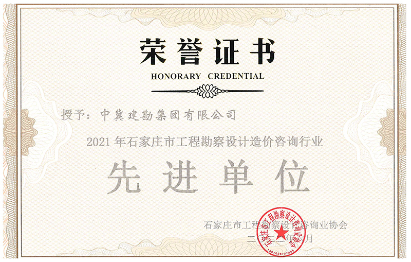 近日,石家莊市工程勘察設計咨詢業(yè)協會下發(fā)文件《關于表彰2021年石家莊市工程勘察設計造價咨詢行業(yè)先進單位和先進個人的通知》(石設協字【2022】6號),我公司被授予“2021年石家莊市工程勘察設計造價咨詢行業(yè)先進單位”稱號,韓立君同志、商衛(wèi)東同志被授予“2021年石家莊市工程勘察設計造價咨詢行業(yè)先進個人”稱號。此榮譽的獲得說明了公司在貫徹高質量發(fā)展戰(zhàn)略方面取得了良好業(yè)績,為推動我市勘察設計行業(yè)高質量發(fā)展做出了積極貢獻,得到了行業(yè)的肯定和認可。