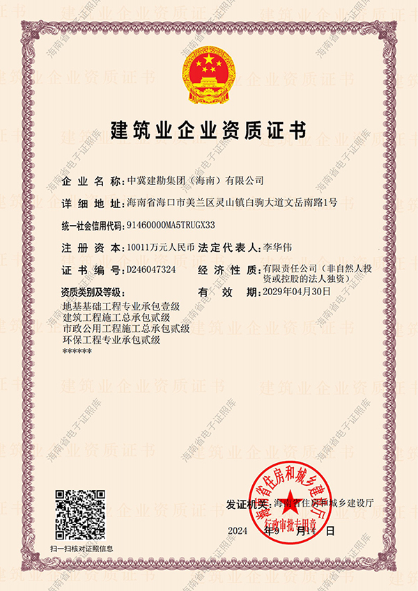 按照公司發(fā)展規(guī)劃,經(jīng)過近半年的努力,海南公司于2024年9月14日通過海南省住建廳審查,成功將地基與基礎(chǔ)工程專業(yè)承包貳級(jí)晉升為壹級(jí)。此項(xiàng)壹級(jí)資質(zhì)的取得,是海南公司資質(zhì)實(shí)力質(zhì)的飛躍,為海南公司持續(xù)發(fā)展,為公司實(shí)施“雙總部建設(shè)”,構(gòu)建“一業(yè)為主,適度多元化發(fā)展”戰(zhàn)略打下了堅(jiān)實(shí)的基礎(chǔ)。