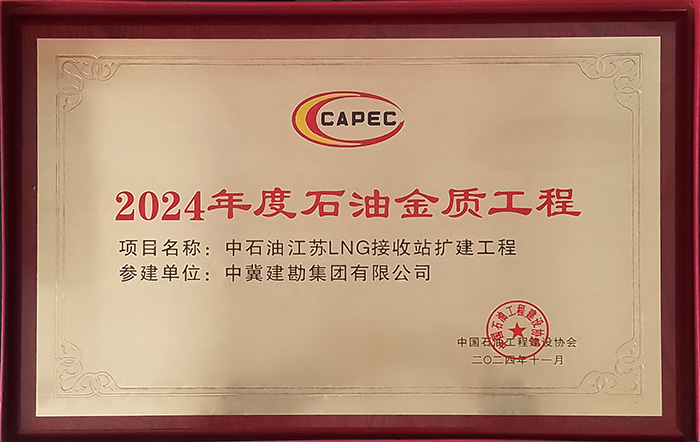 近日,集團(tuán)公司收到中國石油工程建設(shè)協(xié)會(huì)頒發(fā)的獎(jiǎng)牌,由二公司參建的中石油江蘇LNG接收站擴(kuò)建工程項(xiàng)目喜獲“2024年度石油金質(zhì)工程”。