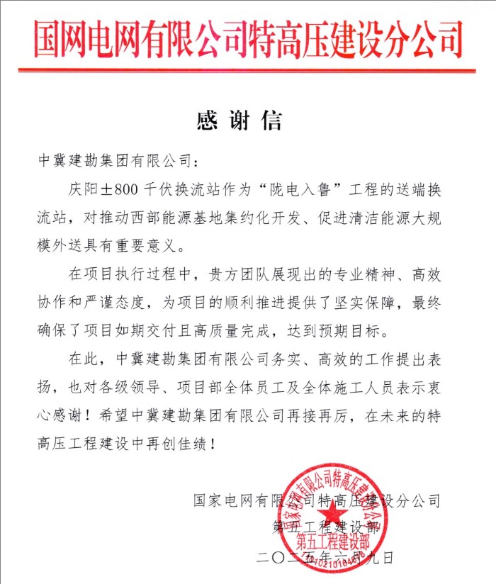 2025年6月9日,在±800千伏隴東-山東特高壓直流工程(簡稱“隴電入魯”)正式投運之際,我公司收到國家電網有限公司特高壓建設分公司對慶陽±800千伏換流站項目發(fā)來的感謝信。信中高度贊揚了我公司在項目執(zhí)行過程中展現(xiàn)出的卓越專業(yè)精神、高效協(xié)作能力和嚴謹工作態(tài)度。