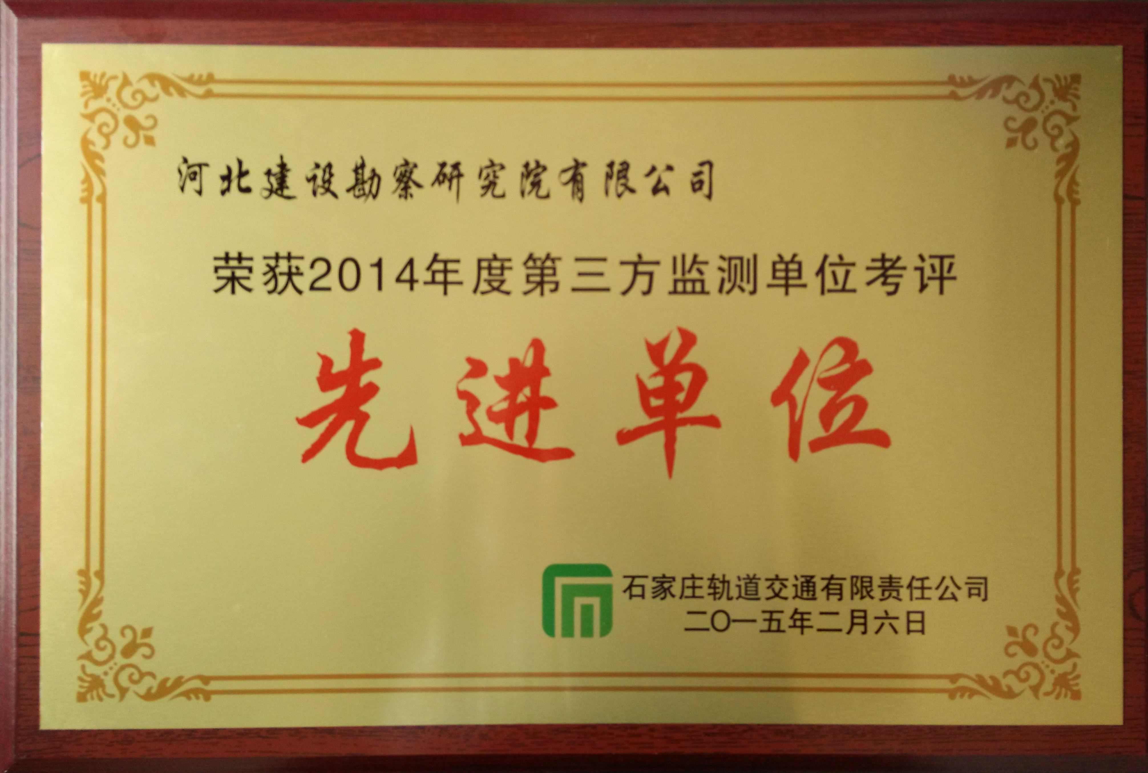 近日,我公司被石家莊軌道交通有限責任公司評為2014年度第三方監(jiān)測單位考評先進單位?!?/span>