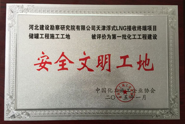 近日,我公司天津浮式LNG接收終端項目儲罐工程施工工地被中國化工施工企業(yè)協(xié)會評為安全文明工地。