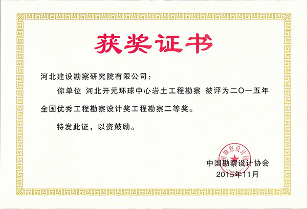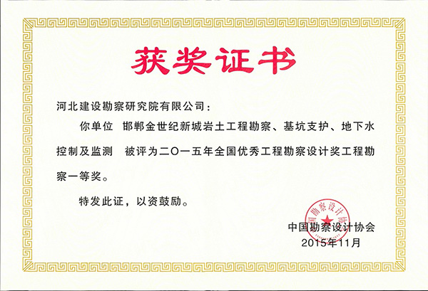 近日,公司兩項(xiàng)工程分別榮獲2015年度全國(guó)優(yōu)秀工程勘察設(shè)計(jì)工程勘察一、二等獎(jiǎng).一等獎(jiǎng):邯鄲金世紀(jì)新城巖土工程勘察、基坑支護(hù)、地下水控制及監(jiān)測(cè);二等獎(jiǎng):河北開元環(huán)球中心巖土工程勘察。