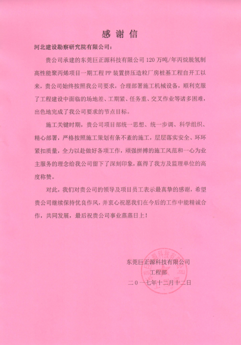 我公司承建的東莞巨正源科技有限公司120萬噸/年丙烷脫氫制高性能聚丙烯項(xiàng)目一期工程—PP裝置擠壓造粒廠房、PDH裝置反應(yīng)框架鉆孔灌注樁基礎(chǔ)工程,克服了施工過程中褚多困難,按照合同節(jié)點(diǎn)圓滿完成施工任務(wù)。東莞巨正源科技有限公司近日發(fā)來感謝信,對(duì)公司領(lǐng)導(dǎo)及項(xiàng)目員工表示最真摯的感謝。