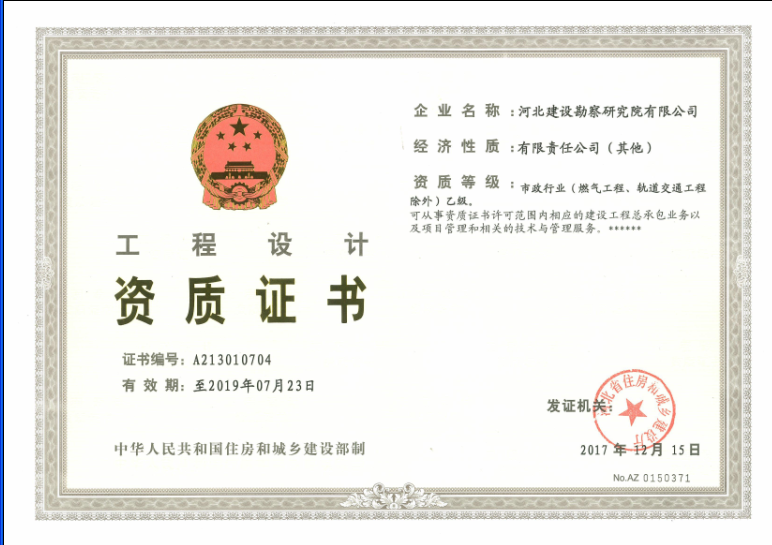 經(jīng)過艱苦努力,我公司于2017年12月15日取得了市政行業(yè)(燃?xì)夤こ?、軌道交通工程除外)設(shè)計乙級資質(zhì)證書,為我公司進(jìn)一步拓展相關(guān)市政設(shè)計業(yè)務(wù),進(jìn)而從事市政建設(shè)工程總承包業(yè)務(wù)創(chuàng)造了良好的條件。