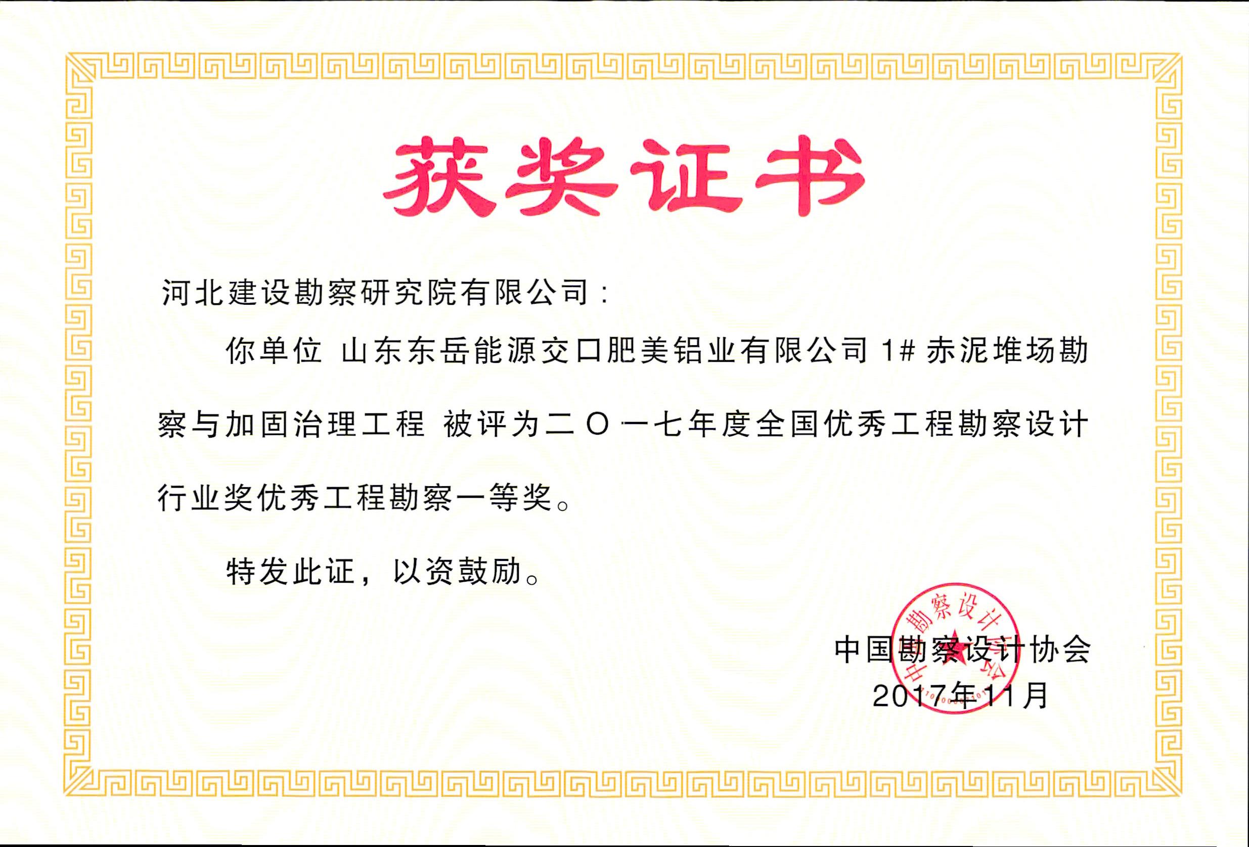根據(jù)中國勘察設(shè)計(jì)協(xié)會(huì)2017年11月29日發(fā)布的中設(shè)協(xié)字【2017】85號(hào)文件《關(guān)于公布2017年度全國優(yōu)秀工程勘察設(shè)計(jì)行業(yè)獎(jiǎng)評選結(jié)果的通知》,我公司兩項(xiàng)工程獲優(yōu)秀工程勘察獎(jiǎng)。其中,山東東岳能源交口肥美鋁業(yè)有限公司1#赤泥堆場勘察與加固治理工程榮獲優(yōu)秀工程勘察一等獎(jiǎng),中海油粵東LNG項(xiàng)目接收站儲(chǔ)罐區(qū)巖土工程勘察榮獲優(yōu)秀工程勘察二等獎(jiǎng)。
