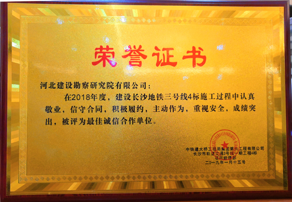 我公司承建的長沙地鐵三號線4標施工監(jiān)測項目,自開工以來精心策劃、有效組織、認真施工、積極與業(yè)主配合。施工過程中我公司認真敬業(yè),信守合同,積極履約,主動作為,重視安全,成績突出,中鐵建大橋工程局集團特授予我公司 “最佳誠信合作單位”榮譽獎牌,以示表彰!
