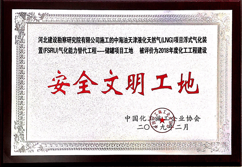 近日傳來(lái)喜訊,我公司承接施工的中海油天津液化天然氣(LNG)項(xiàng)目浮式氣化裝置(FSRU)氣化能力替代工程-儲(chǔ)罐項(xiàng)目樁基工程工地被評(píng)為2018年度中國(guó)化工工程建設(shè)安全文明工地,紅彤彤的證書(shū)不僅是榮譽(yù)和驕傲,也是對(duì)我們中海油天津LNG替代工程項(xiàng)目部全體員工付出汗水的最好回報(bào)和肯定。