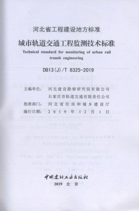 近日我公司主編的河北省工程建設(shè)地方標(biāo)準(zhǔn)《城市軌道交通工程監(jiān)測技術(shù)標(biāo)準(zhǔn)》(DB13(J)/T8325-2019)由河北省住房和城鄉(xiāng)建設(shè)廳發(fā)布,于2019年12月1日起實施,正式出版發(fā)行。這是由我公司主編發(fā)行的第11項地方標(biāo)準(zhǔn)。