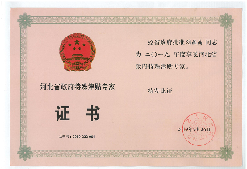經(jīng)公司組織申報(bào),石家莊市人民政府推薦,省人力資源和社會(huì)保障廳評(píng)審,省政府同意,公司劉晶晶同志榮獲省政府特殊津貼專(zhuān)家稱(chēng)號(hào)。