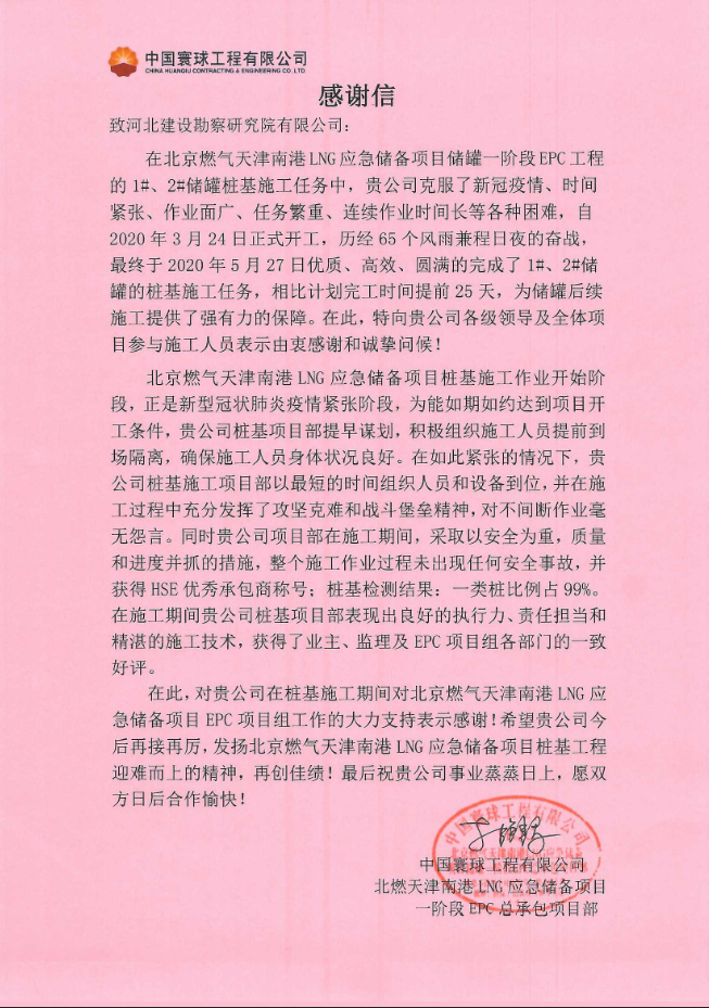 由我公司承建的北京燃?xì)馓旖蚰细跮NG應(yīng)急儲(chǔ)備項(xiàng)目1#、2#儲(chǔ)罐樁基工程,自2020年3月24日正式開工,歷經(jīng)65個(gè)日夜的奮戰(zhàn),最終于2020年5月27日優(yōu)質(zhì)、高效、圓滿的完成了1#、2#儲(chǔ)罐的樁基施工任務(wù)。中國(guó)寰球工程有限公司北京燃?xì)馓旖蚰细跮NG應(yīng)急儲(chǔ)備項(xiàng)目?jī)?chǔ)罐一階段EPC項(xiàng)目組,對(duì)我公司北燃樁基項(xiàng)目組表示由衷的感謝,感謝我公司領(lǐng)導(dǎo)及全體項(xiàng)目施工人員的辛勤付出,在克服了新冠疫情、時(shí)間緊張、作業(yè)面廣、任務(wù)繁重、連續(xù)作業(yè)時(shí)間長(zhǎng)等各種困難的情況下,奮勇向前,較原定工期提前25天完成施工任務(wù),為項(xiàng)目后續(xù)施工帶來(lái)了強(qiáng)有力的工期保障。同時(shí)對(duì)我公司在樁基施工期間對(duì)北京燃?xì)馓旖蚰细跮NG應(yīng)急儲(chǔ)備項(xiàng)目EPC項(xiàng)目組工作的大力支持表示感謝!希望我公司今后再接再厲,繼續(xù)發(fā)揚(yáng)迎難而上的精神,再創(chuàng)佳績(jī)!