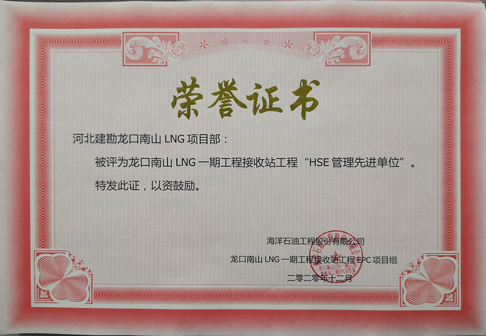 2020年12月,公司收到海洋石油工程股份有限公司發(fā)來的表揚(yáng)信,對(duì)我公司在龍口南山LNG一期工程接收站工程EPC項(xiàng)目?jī)?chǔ)罐樁基工程標(biāo)段一施工過程中,面對(duì)施工現(xiàn)場(chǎng)地質(zhì)情況復(fù)雜、新工藝、施工難度大、氣候炎熱多雨、新冠疫情、人材機(jī)緊缺等不利因素,按合同要求順利完成了一標(biāo)段1#和2#儲(chǔ)罐3497根振沖碎石樁和720根樁柱一體化灌注樁全部施工任務(wù),給予了高度認(rèn)可和好評(píng),并表示感謝!我公司被評(píng)為“質(zhì)量管理先進(jìn)單位”和“HSE管理先進(jìn)單位”并頒發(fā)了榮譽(yù)證書,同時(shí)對(duì)先進(jìn)個(gè)人頒發(fā)了“優(yōu)秀項(xiàng)目管理者”、 “HSE管理先進(jìn)個(gè)人”、 “質(zhì)量管理先進(jìn)個(gè)人”榮譽(yù)證書。
