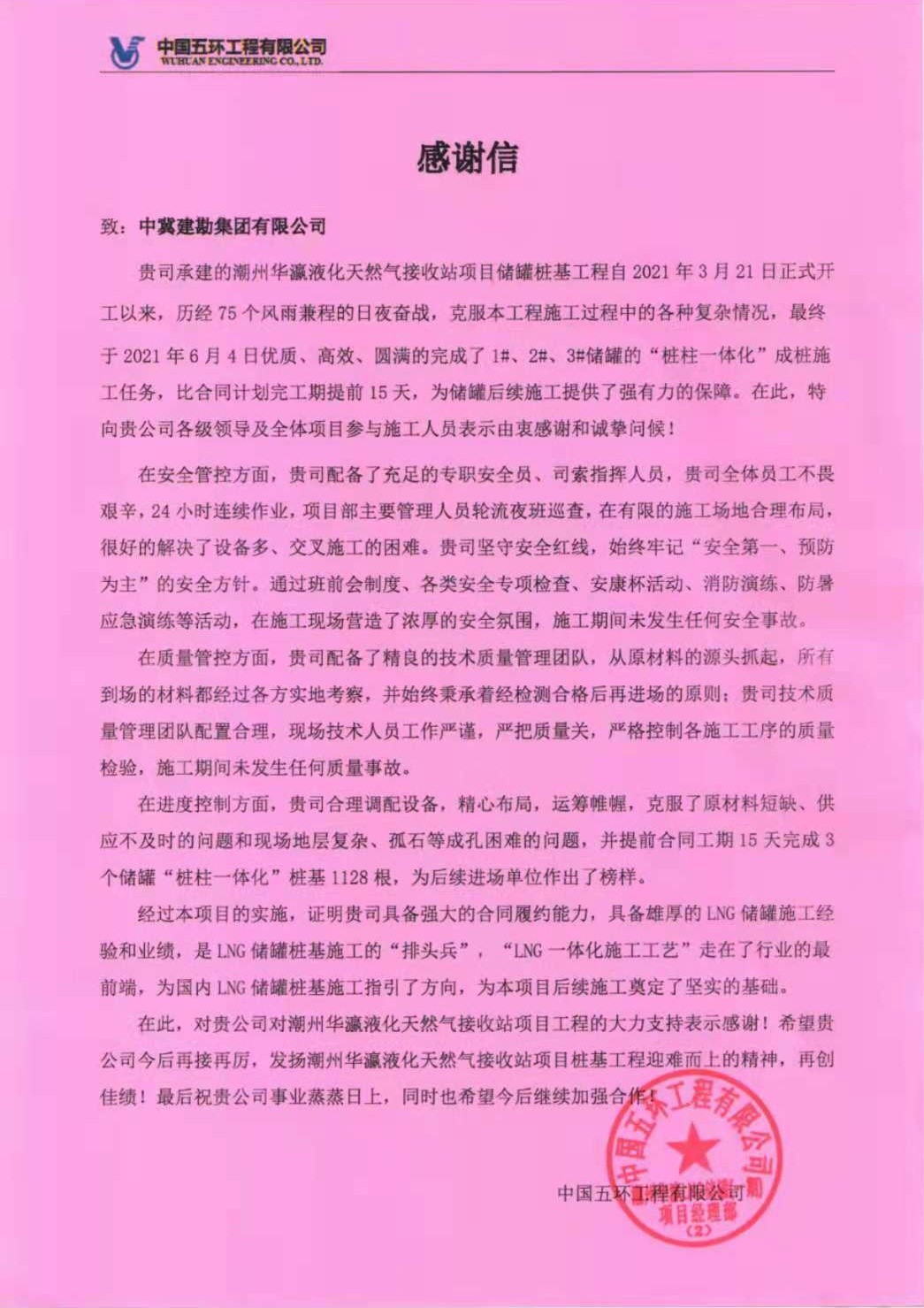 近日,由我公司承建的潮州華瀛液化天然氣接收站項(xiàng)目?jī)?chǔ)罐工程樁基施工項(xiàng)目,榮獲華瀛天然氣股份有限公司和中國(guó)五環(huán)工程有限公司潮州華瀛LNG項(xiàng)目部頒發(fā)的“優(yōu)秀承包商”、“質(zhì)量管理先進(jìn)單位”和“優(yōu)秀HSE管理團(tuán)隊(duì)”的榮譽(yù)獎(jiǎng)牌以及感謝信。