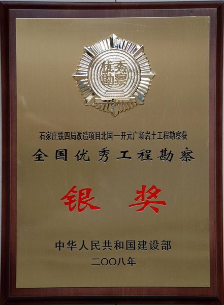 根據(jù)中華人民共和國(guó)建設(shè)部第807號(hào)文件,關(guān)于公布2006年度全國(guó)優(yōu)秀工程勘察設(shè)計(jì)獎(jiǎng)的公告,我單位石家莊鐵四局改造項(xiàng)目北國(guó)—開(kāi)元廣場(chǎng)巖土工程勘察獲銀質(zhì)獎(jiǎng)。