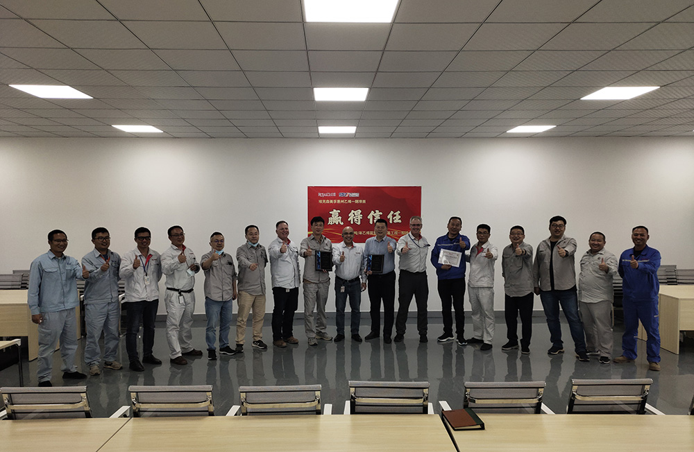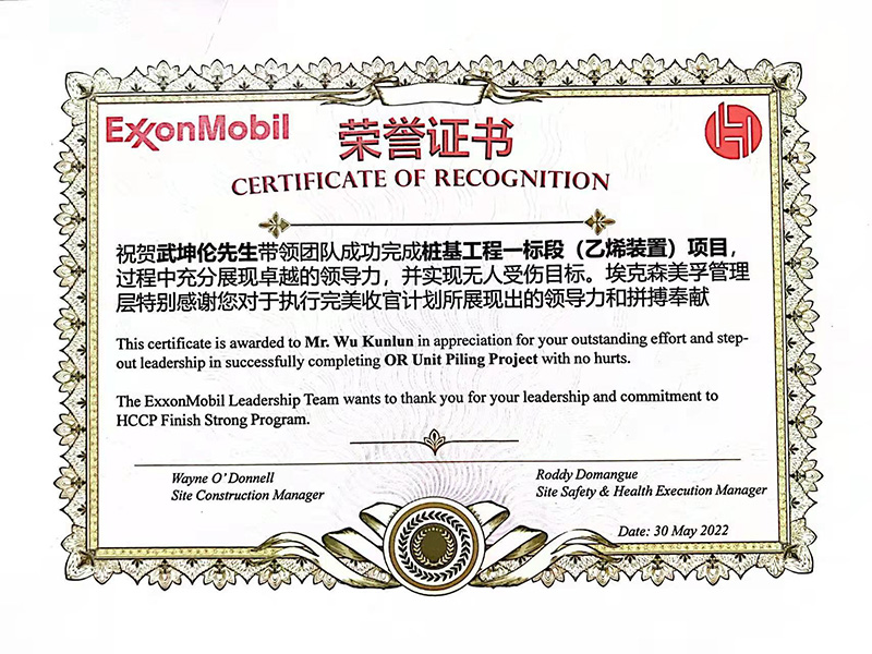 5月30日,??松梨冢ɑ葜荩┗び邢薰菊匍_2022年工作表彰大會(huì),我公司參建的惠州美孚乙烯一期樁基工程項(xiàng)目部,在參建的30余家施工單位中以優(yōu)異的成績(jī),榮獲“優(yōu)秀管理團(tuán)隊(duì)”稱號(hào),生產(chǎn)設(shè)備科科長(zhǎng)兼項(xiàng)目經(jīng)理武坤倫榮獲 “卓越領(lǐng)導(dǎo)力”個(gè)人榮譽(yù)證書,項(xiàng)目部每位員工都收到了業(yè)主頒發(fā)的獎(jiǎng)品。