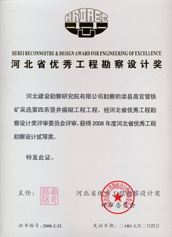 灤縣高官營鐵礦采選第四采豎井掘砌工程獲河北省優(yōu)秀工程勘察設(shè)計(jì)二等獎。