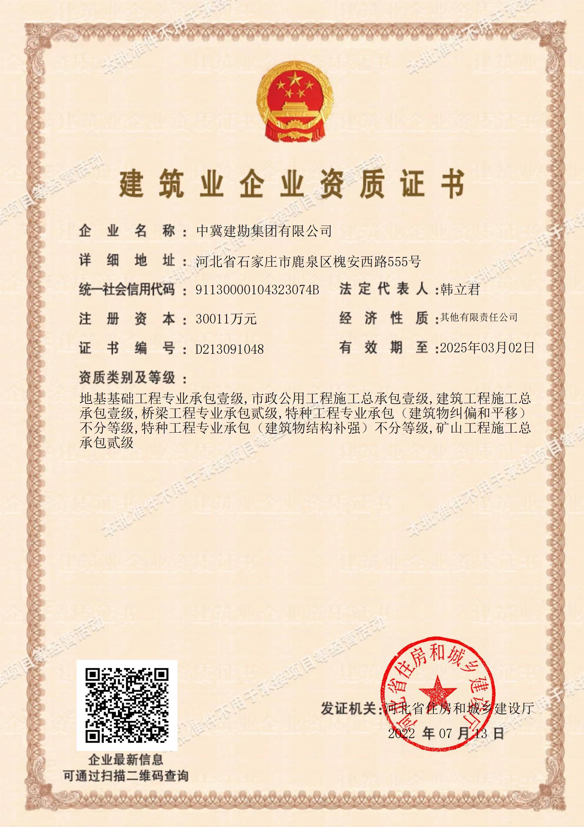 在集團(tuán)公司領(lǐng)導(dǎo)的運(yùn)籌帷幄下,經(jīng)過近半年的不懈努力,集團(tuán)公司于2022年7月13日喜獲建筑工程施工總承包壹級資質(zhì),該資質(zhì)的取得將有力促進(jìn)我公司建筑施工總承包業(yè)務(wù)開展,對公司轉(zhuǎn)型升級、地方市場開拓將起到重要作用,為公司持續(xù)穩(wěn)定發(fā)展奠定更加堅(jiān)實(shí)的基礎(chǔ)。