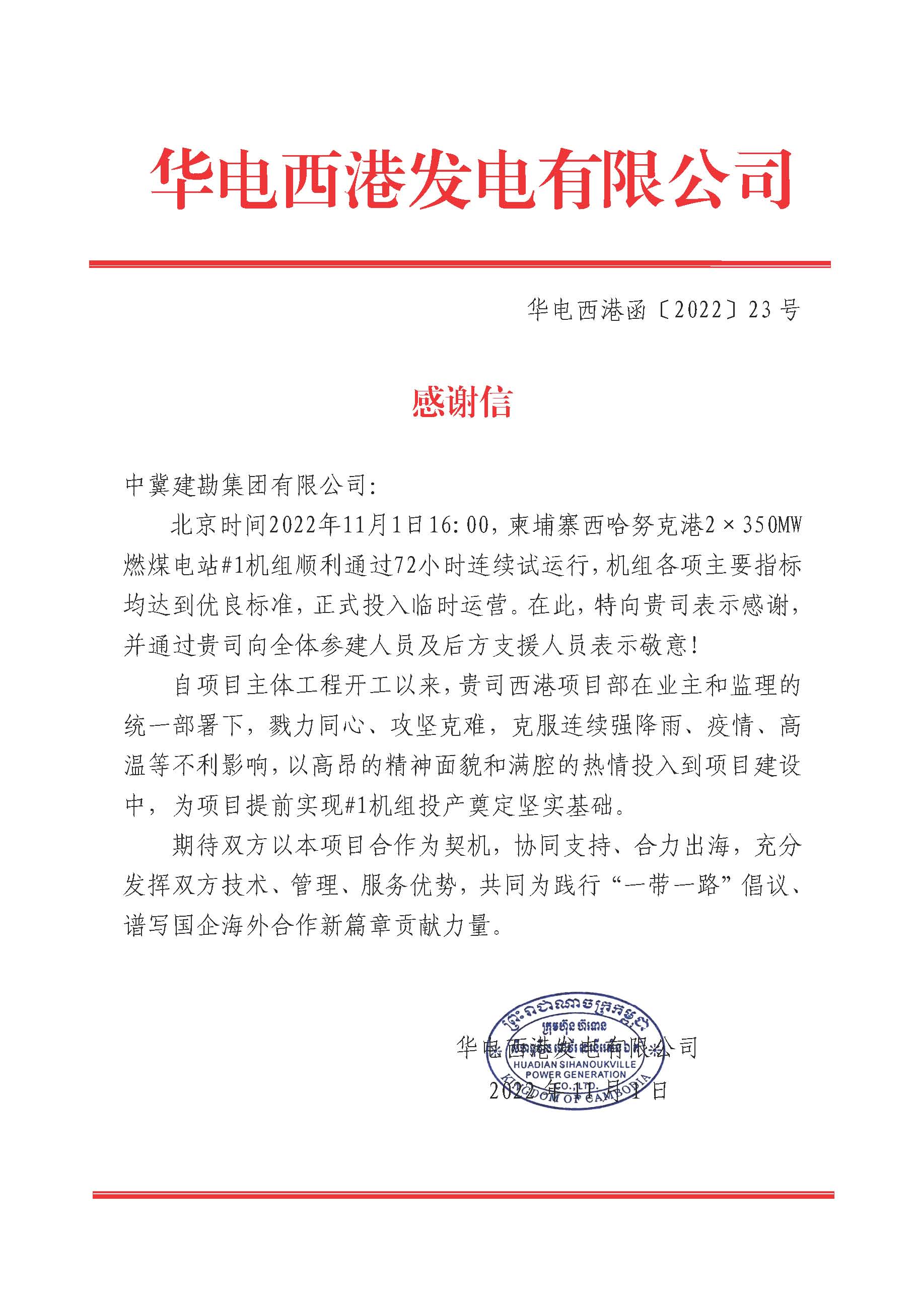 北京時間2022年11月1日16:00,由我公司承建的柬埔寨西哈努克港2×350MW燃煤電站#1機組順利通過柬埔寨國家電力公司要求的滿負荷性能試驗,標志著中國華電在柬投資興建的最大火電項目首臺機組正式投產(chǎn)發(fā)電。該項目是中國華電在“一帶一路”沿線國家投資建設的重點工程,也是目前中國在柬單體投資最大電源項目。業(yè)主華電西港發(fā)電有限公司特向我公司表示感謝,并對我公司全體參建人員及后方支持人員表示敬意!