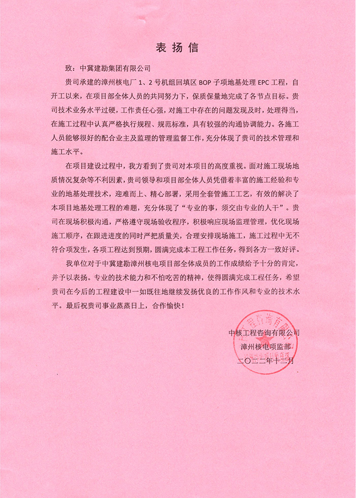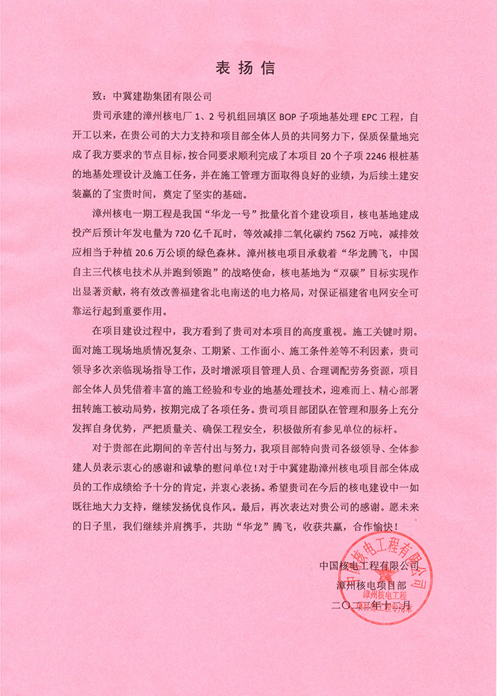 漳州核電一期工程是我國“華龍一號”批量化首個建設(shè)項(xiàng)目,承載著“華龍騰飛,中國自主三代核電技術(shù)從并跑到領(lǐng)跑”的戰(zhàn)略使命,核電基地為“雙碳”目標(biāo)實(shí)現(xiàn)作出顯著貢獻(xiàn),是國家核電建設(shè)的重點(diǎn)項(xiàng)目。在工程建設(shè)過程中面對規(guī)模較大、場地分散、交叉施工等多項(xiàng)不利因素,項(xiàng)目部迎難而上、精心部署、晝夜施工,確保安全、質(zhì)量的情況下按期完成了各項(xiàng)任務(wù)。項(xiàng)目部在谷習(xí)光同志的帶領(lǐng)下,在管理和服務(wù)上充分發(fā)揮自身優(yōu)勢,積極爭當(dāng)所有參見單位的標(biāo)桿,得到了甲方和監(jiān)理的高度贊揚(yáng),為以后更多的合作奠定了堅(jiān)實(shí)基礎(chǔ)。