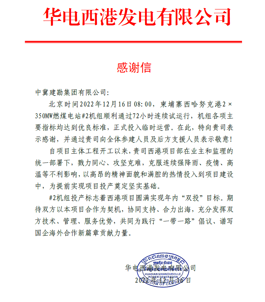 柬埔寨西哈努克港2×350MW燃煤電站#1機(jī)組順利通過柬埔寨國家電力公司要求的滿負(fù)荷性能試驗(yàn),標(biāo)志著中國華電在柬投資興建的最大火電項(xiàng)目首臺機(jī)組正式投產(chǎn)發(fā)電。自該項(xiàng)目主體工程開工以來,西港項(xiàng)目部全體人員在業(yè)主和監(jiān)理的統(tǒng)一部署下,勠力同心、攻堅(jiān)克難,克服連續(xù)降雨、疫情、高溫等不利影響,以高昂的精神面貌和滿腔的熱情投入到項(xiàng)目建設(shè)中,為項(xiàng)目提前實(shí)現(xiàn)#1機(jī)組投產(chǎn)奠定堅(jiān)實(shí)基礎(chǔ)。