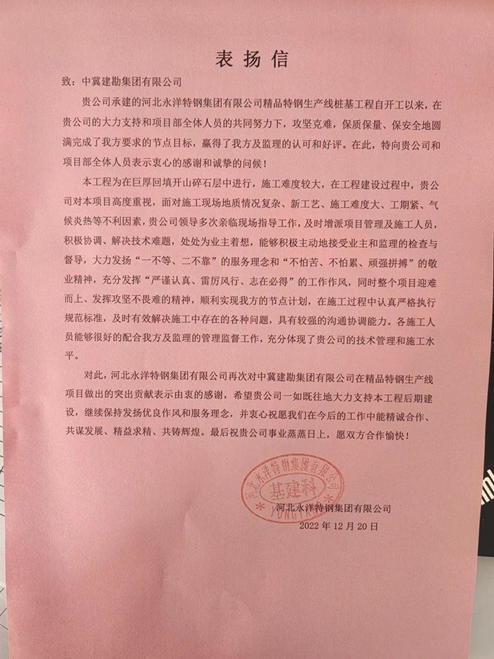 河北永洋特鋼集團(tuán)有限公司精品特鋼生產(chǎn)線樁基工程自開工以來,在項(xiàng)目部全體人員的共同努力下,攻堅(jiān)克難,保質(zhì)保量保安全地圓滿完成了業(yè)主要求的節(jié)點(diǎn)目標(biāo),大力發(fā)揚(yáng)“一不等、二不靠”的服務(wù)理念和“不怕苦、不怕累、頑強(qiáng)拼搏”的敬業(yè)精神,贏得了業(yè)主及監(jiān)理的認(rèn)可和好評。