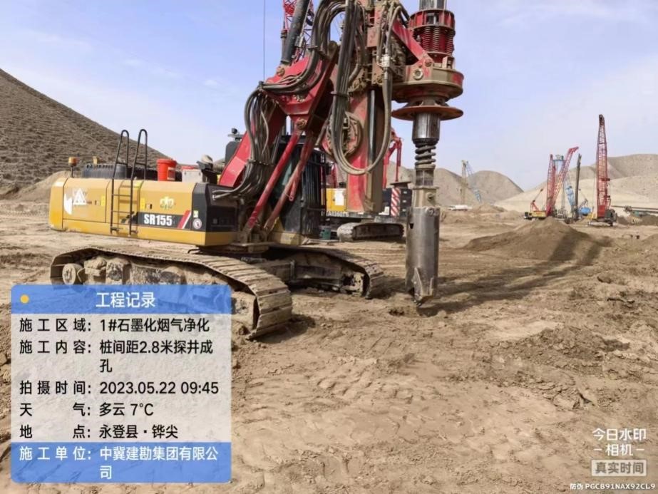 蘭碳一期6萬噸碳電極項目SDDC樁施工工程于2023年05月24日開工, 2023年6月23日完工。經(jīng)過SDDC樁處理后,本工程的黃土問題得以改善,地基承載能力有所增強。此工藝具有高效、工期短的特點。對回收的黃土進行資源化處理,減少了工程支出。