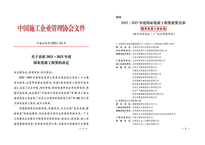 12月9日,中國施工企業(yè)管理協(xié)會發(fā)布了《關于表彰2022-2023年度國家優(yōu)質(zhì)工程獎的決定》(中施企協(xié)字[2023]124號),我公司參與建設的3項工程獲得國家優(yōu)質(zhì)工程獎,其中1項工程獲得國家優(yōu)質(zhì)工程金獎。