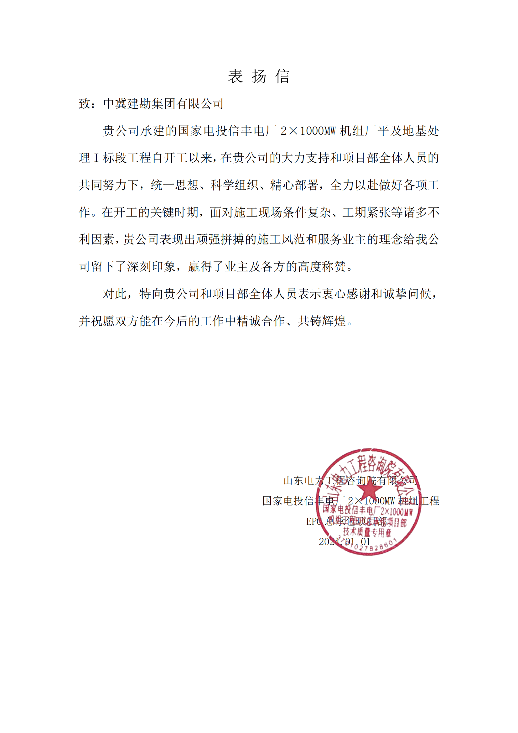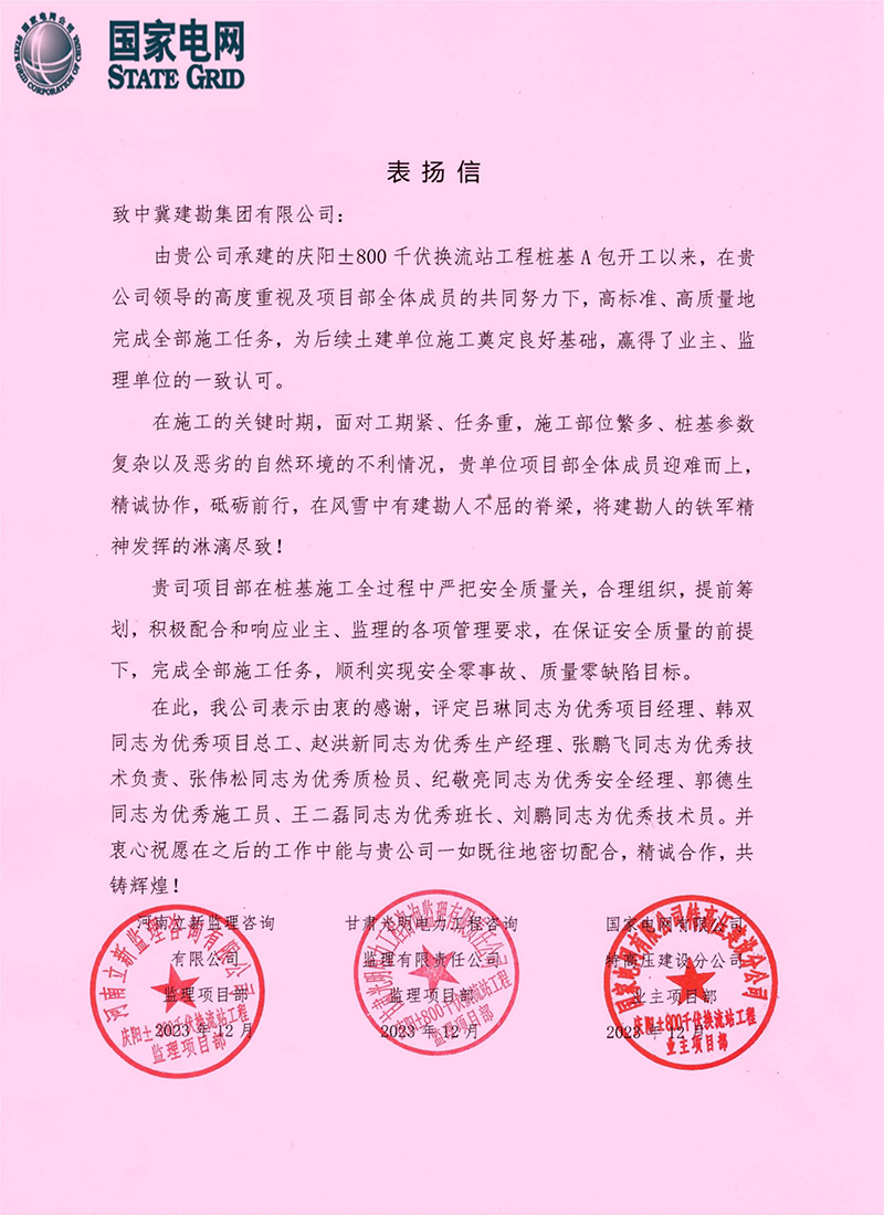 公司收到了國家電網(wǎng)慶陽±800千伏換流站工程由業(yè)主國家電網(wǎng)和監(jiān)理單位河南立新及甘肅光明的聯(lián)合表揚(yáng)信,表揚(yáng)信中說在我公司領(lǐng)導(dǎo)的高度重視及項目部全體成員的共同努力下,高標(biāo)準(zhǔn)、高質(zhì)量地完成施工任務(wù),為后續(xù)土建單位施工奠定良好基礎(chǔ),贏得了業(yè)主、監(jiān)理單位的一致認(rèn)可。在施工的關(guān)鍵時期,我單位項目部全體成員迎難而上,精誠協(xié)作,砥礪前行,在風(fēng)雪中有建勘人不屈的脊梁,將建勘人的鐵軍精神發(fā)揮的淋漓盡致!