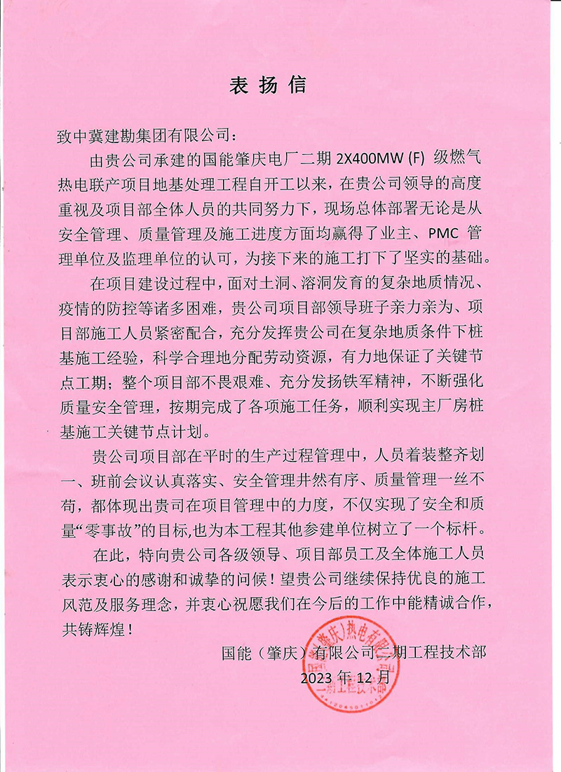 國能肇慶電廠二期2×400MW(F)級燃?xì)鉄犭娐?lián)產(chǎn)項目為二期擴(kuò)建工程,在總公司及領(lǐng)導(dǎo)們的幫助下攻堅克難,面對土洞、溶洞發(fā)育的復(fù)雜地質(zhì)情況、疫情的防控等諸多困難,充分發(fā)揚(yáng)鐵軍精神,不斷強(qiáng)化質(zhì)量安全管理,積極配合業(yè)主進(jìn)度計劃,按期完成了各項施工任務(wù)。我單位在安全管理、施工質(zhì)量管理方面為建設(shè)方、PMC管理單位、監(jiān)理方留下深刻影響,為此項目部得到了國能(肇慶)熱電有限公司的高度認(rèn)可!