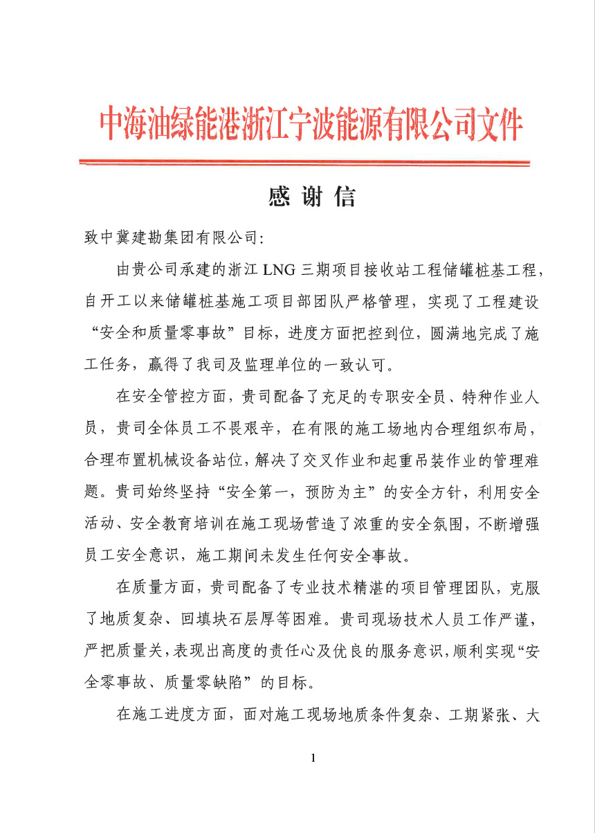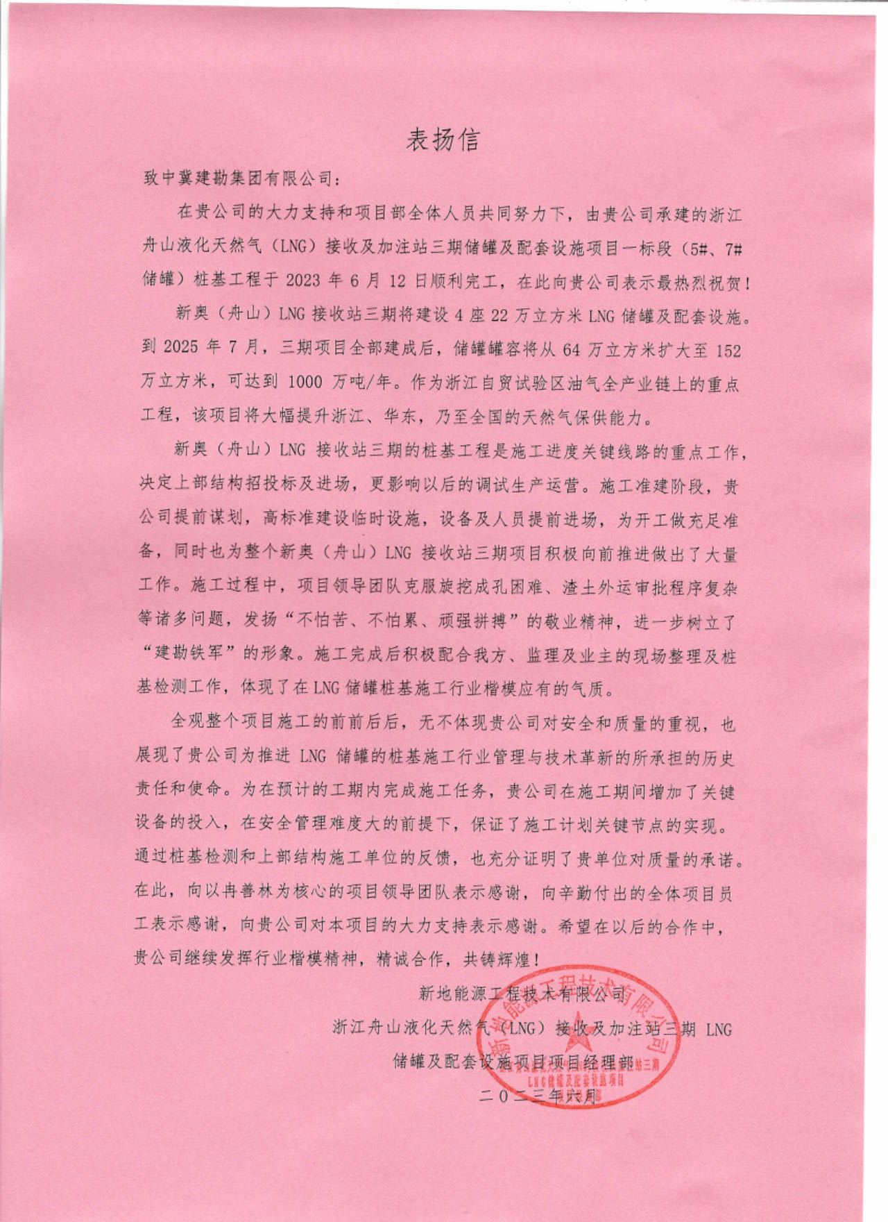浙江舟山液化天然氣(LNG)接收及加注站三期LNG儲罐及配套設(shè)施項目(5#、7#儲罐樁基工程)于2023年6月25日收到新地能源工程技術(shù)有限公司發(fā)來的表揚(yáng)信。自開工以來,在公司的大力支持和項目部全體員工的共同努力下,精心組織、全力布局,克服了前期施工任務(wù)重等諸多困難,安全、高效、優(yōu)質(zhì)的完成了儲罐的樁基施工任務(wù),有力保障了本項目總體工期計劃,贏得了監(jiān)理單位和業(yè)主單位的一致認(rèn)可和好評。