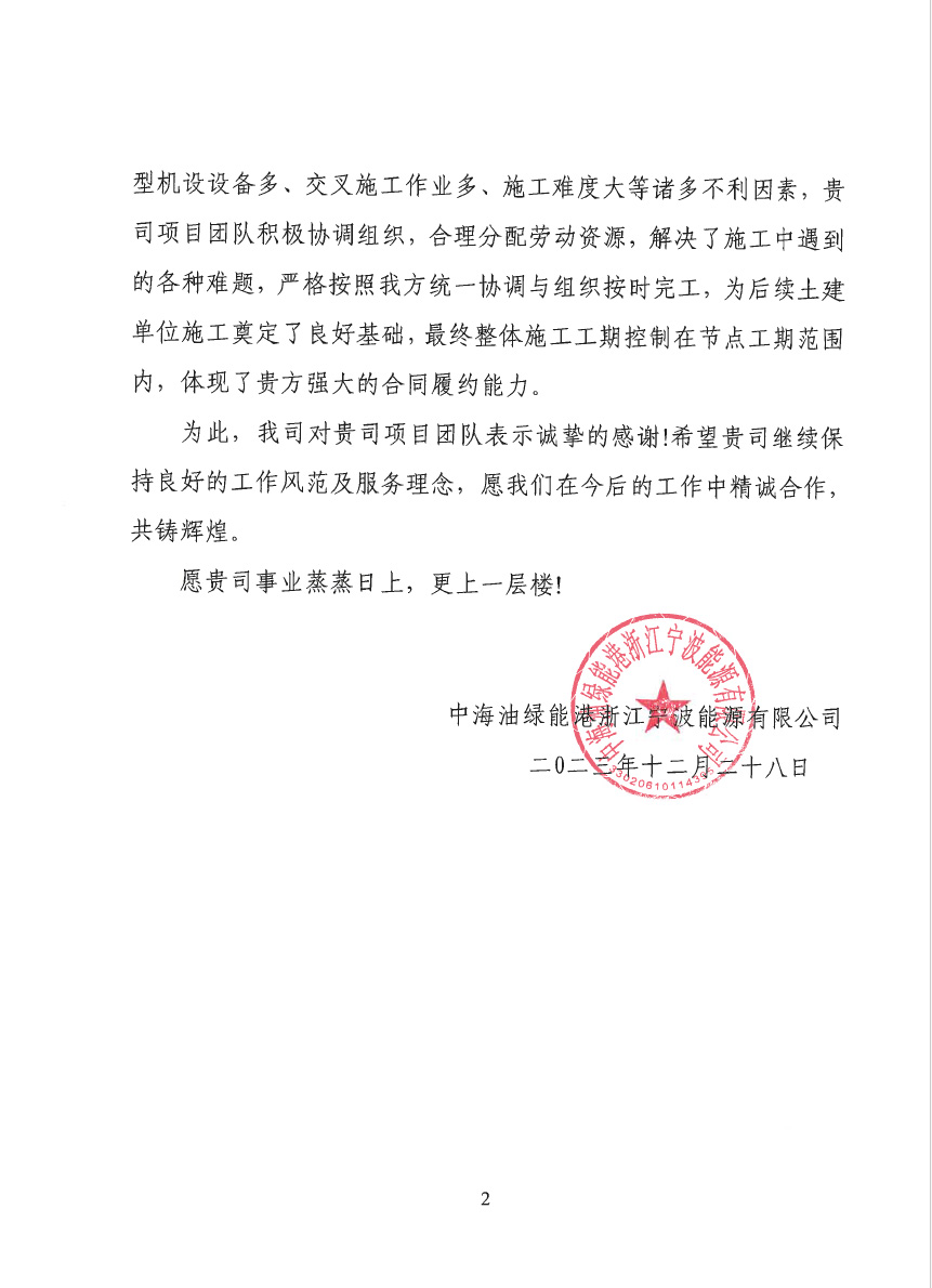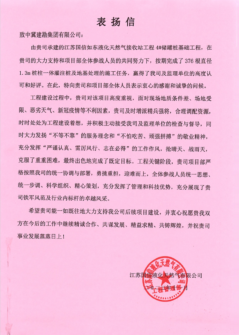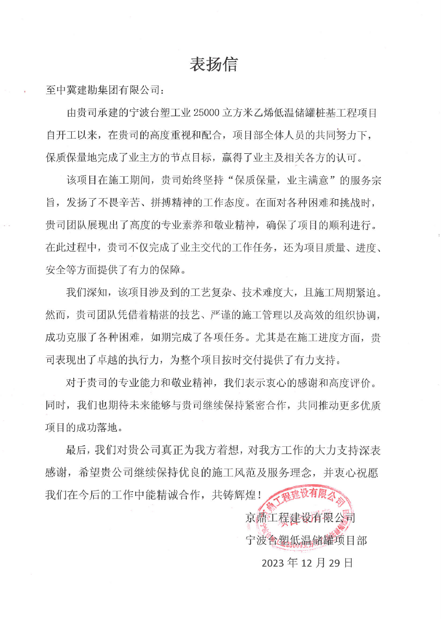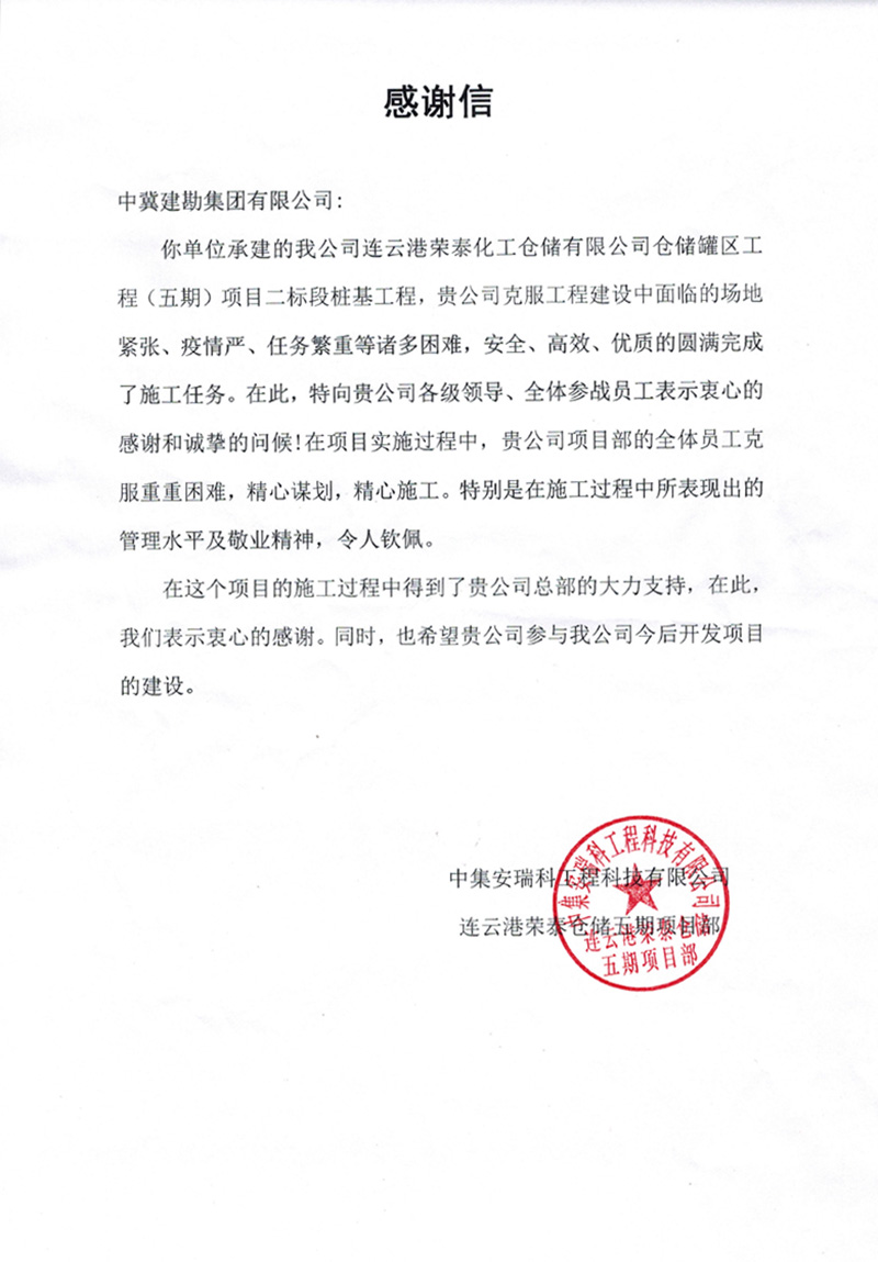 連云港榮泰化工倉儲有限公司倉儲罐區(qū)工程(五期)項目二標(biāo)段樁基工程,業(yè)主在表揚(yáng)信中說:貴公司克服工程建設(shè)中面臨的場地緊張、疫情嚴(yán)、任務(wù)繁重等諸多困難,安全、高效、優(yōu)質(zhì)的圓滿完成了施工任務(wù)。貴公司項目部全體員工克服重重困難,精心謀劃,精心施工。特別是在施工中所表現(xiàn)出的管理水平及敬業(yè)精神,令人欽佩。