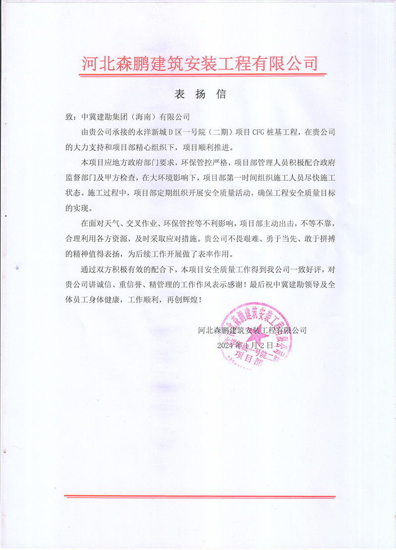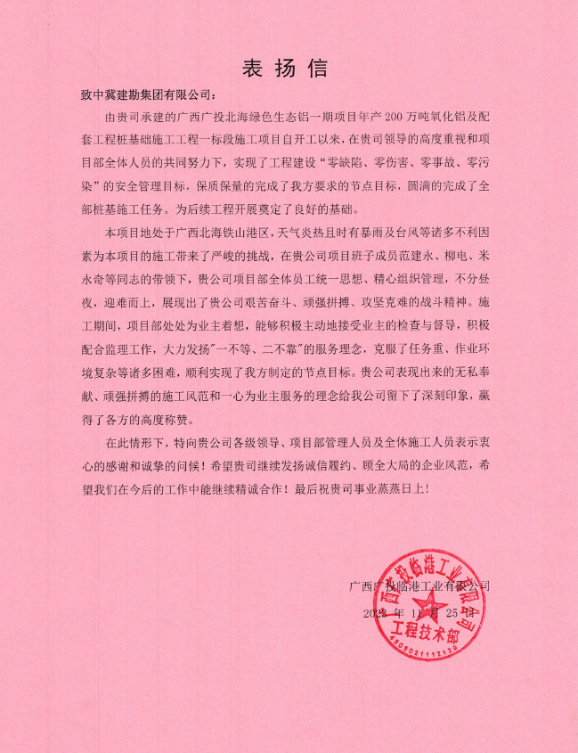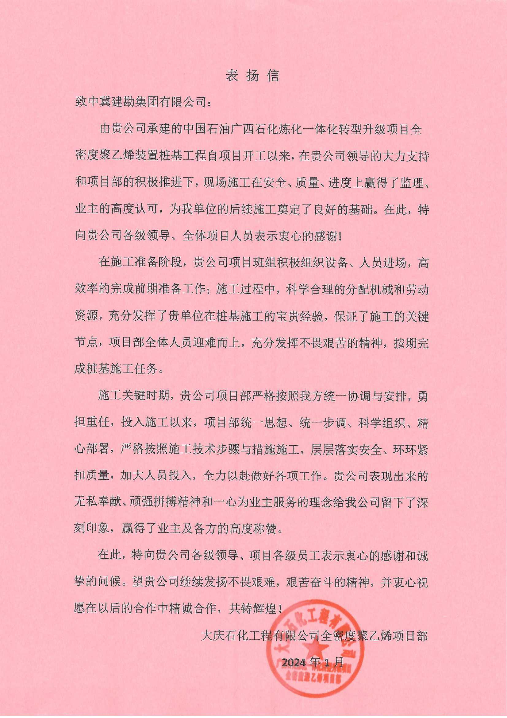 廣西石化煉化項目部接收到大慶石化工程有限公司全密度聚乙烯工程建設(shè)部項目經(jīng)理牛家偉發(fā)來的表揚(yáng)信,信中肯定了我項目部在廣西石化煉化項目樁基工程中所取得的成果。
