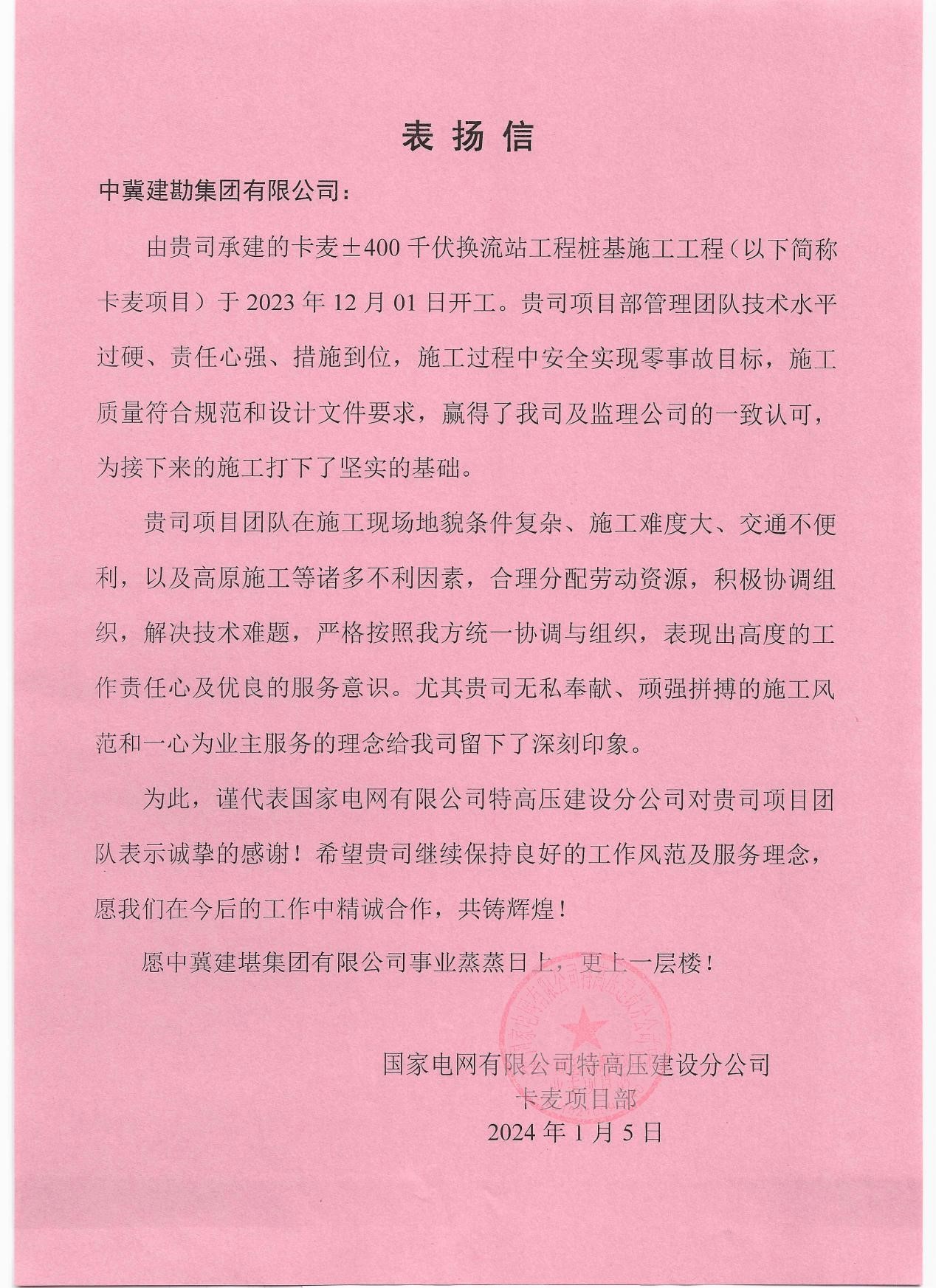 卡麥±400千伏換流站工程樁基施工工程收到業(yè)主國家電網(wǎng)有限公司特高壓建設(shè)分公司發(fā)來的表揚(yáng)信。項目部敢打硬仗的精神面貌,贏得了業(yè)主方的高度贊賞和認(rèn)可。