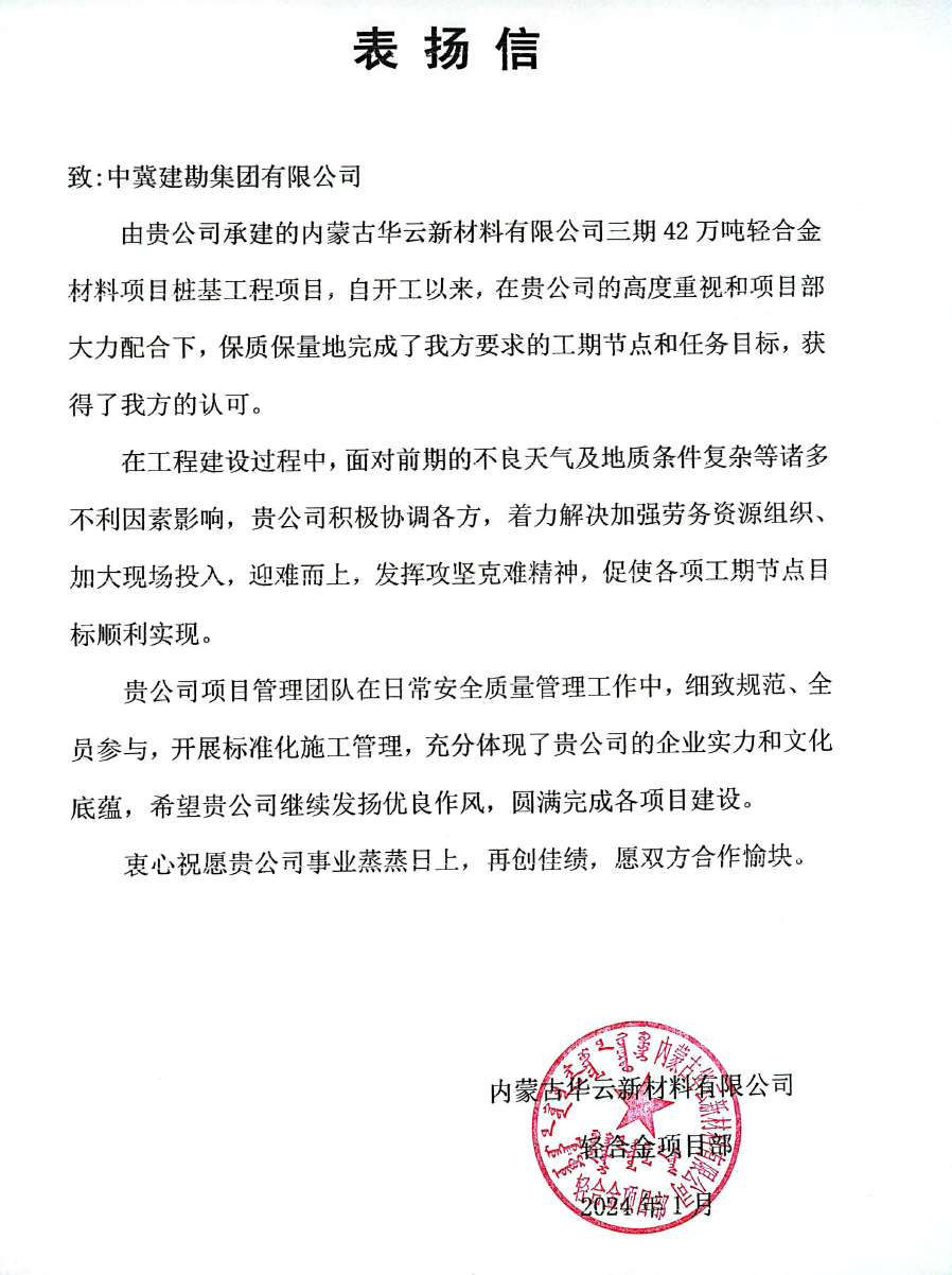 內(nèi)蒙古華云新材料有限公司三期42萬噸輕合金材料項目樁基工程,在工程建設(shè)過程中,面對前期的不良天氣及地質(zhì)條件復(fù)雜等諸多不利因素影響,積極協(xié)調(diào)各方,著力解決加強(qiáng)勞務(wù)資源組織、加大現(xiàn)場投入,迎難而上,發(fā)揮攻堅克難精神,保質(zhì)保量地完成了工期節(jié)點(diǎn)和任務(wù)目標(biāo),獲得甲方的認(rèn)可。