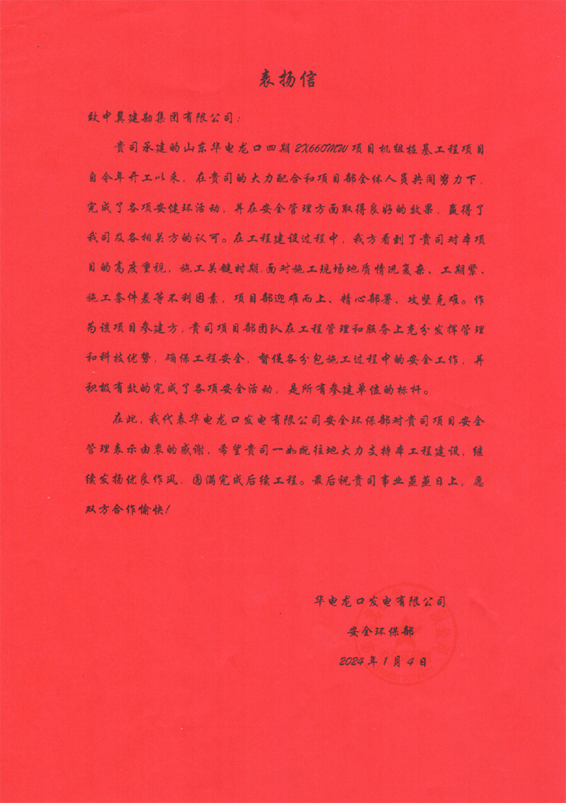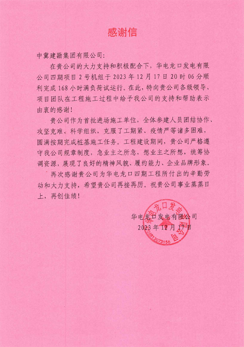 華電龍口發(fā)電有限公司四期項目2號機(jī)組于2023年12月17日20時04分順利完成168小時滿負(fù)荷試運(yùn)行。工程建設(shè)期間,完成了各項安健環(huán)活動,并在安全管理方面取得良好的效果,贏得了業(yè)主方認(rèn)可。我公司人員嚴(yán)格遵守我公司規(guī)章制度,急業(yè)主之所急,想業(yè)主之所想,統(tǒng)籌協(xié)調(diào)資源,展現(xiàn)了良好的精神風(fēng)貌、履約能力、企業(yè)品牌形象。為此,業(yè)主特向我公司各級領(lǐng)導(dǎo)、項目團(tuán)隊在工程施工過程中給予的支持和幫助表示由衷感謝。