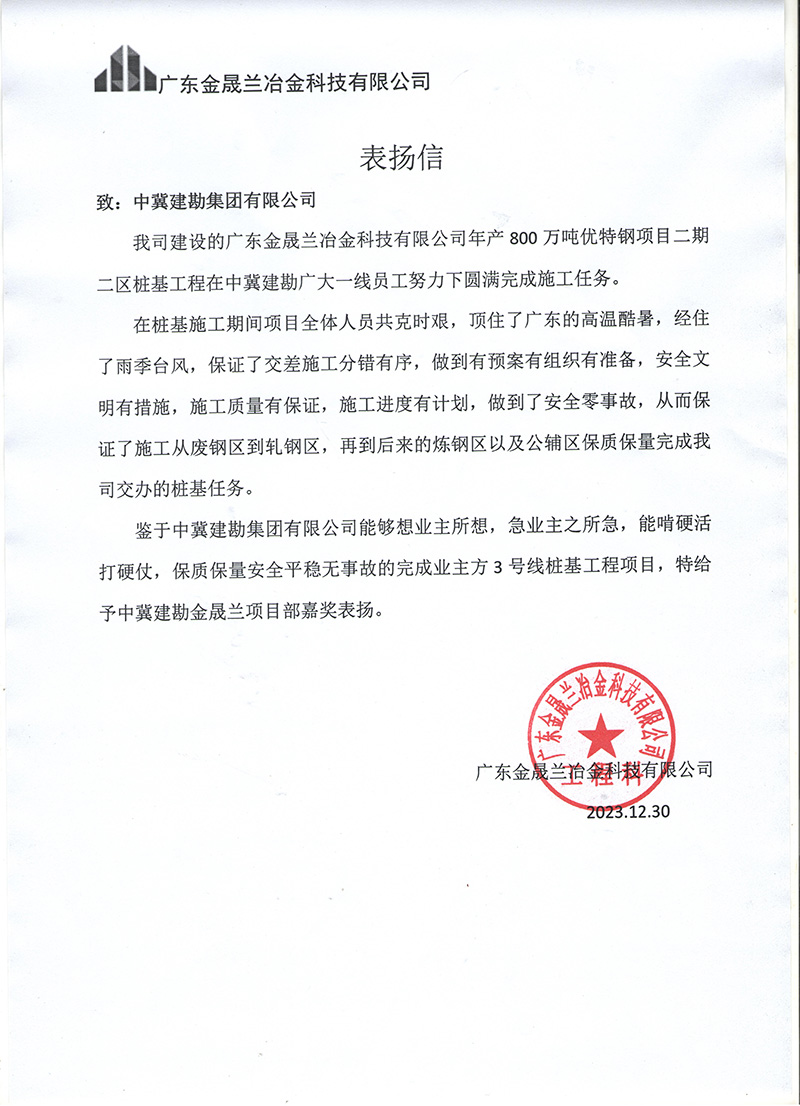 廣東金盛蘭冶金科技有限公司年產(chǎn)800萬噸優(yōu)特鋼項目二期二區(qū)樁基工程,在施工期間項目全體人員共克時艱,頂住了廣東的高溫酷暑,經(jīng)住了雨季臺風(fēng),保證了交差施工分錯有序,做到了預(yù)案有組織有準(zhǔn)備,安全文明有措施,施工質(zhì)量有保證,施工進(jìn)度有計劃,做到了安全零事故,保質(zhì)保量的完成任務(wù),業(yè)主對項目給予嘉獎表揚(yáng)。