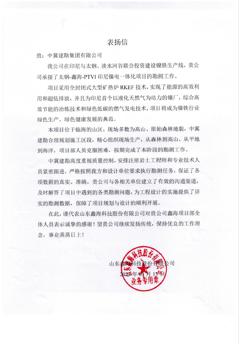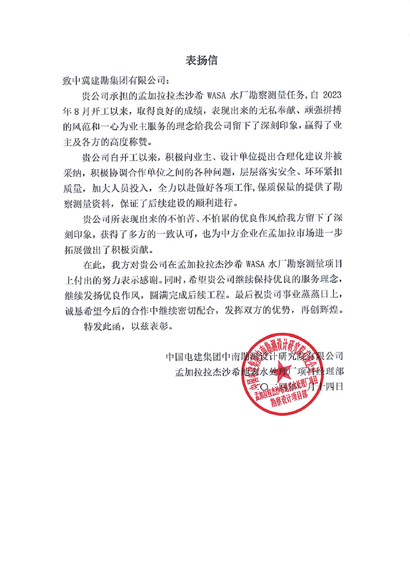 中國(guó)機(jī)械設(shè)備工程股份有限公司發(fā)來(lái)的表?yè)P(yáng)信,對(duì)在烏茲別克斯坦謝拉巴德 500MWp/456.6MWac 太陽(yáng)能電站項(xiàng)目建設(shè)過(guò)程中,項(xiàng)目全體人員克服諸多不利因素,發(fā)揚(yáng)建勘精神,盡一切努力推進(jìn)工程建設(shè),以及公司的專業(yè)性、敬業(yè)態(tài)度和管理水平給予了高度評(píng)價(jià)。同時(shí),對(duì)項(xiàng)目管理團(tuán)隊(duì)及所有參建人員表示由衷的感謝,并希望雙方精誠(chéng)合作,攜手并進(jìn),共同推進(jìn)其他項(xiàng)目的開(kāi)發(fā)建設(shè)。
