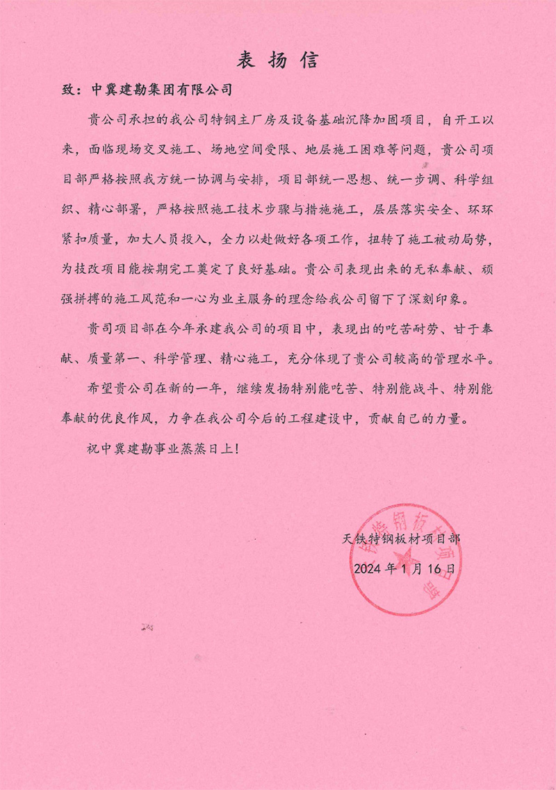 近日,集團(tuán)公司陸續(xù)收到國(guó)內(nèi)外項(xiàng)目業(yè)主發(fā)來(lái)的表?yè)P(yáng)信,信中對(duì)我公司的項(xiàng)目管理、團(tuán)隊(duì)建設(shè)、安全文明施工、技術(shù)質(zhì)量管控等,給予了高度評(píng)價(jià),同時(shí)送上了新年一年的祝福。