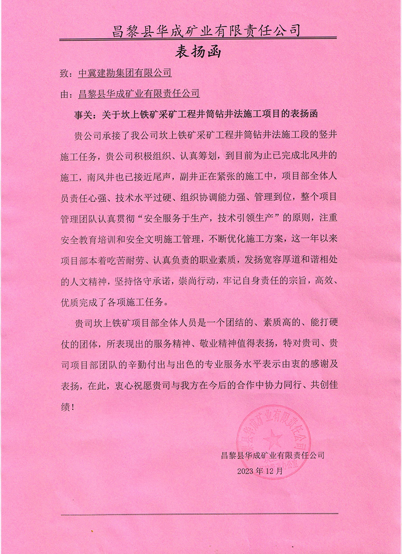 昌黎縣華成礦業(yè)有限責(zé)任公司發(fā)來(lái)的表?yè)P(yáng)函,對(duì)我公司在坎上鐵礦采礦工程井筒鉆進(jìn)法施工項(xiàng)目施工過(guò)程中,積極組織,認(rèn)真籌劃,以及項(xiàng)目部全體人員責(zé)任心強(qiáng)、技術(shù)水平過(guò)硬、組織協(xié)調(diào)能力強(qiáng)、管理到位,認(rèn)真貫徹“安全服務(wù)于生產(chǎn),技術(shù)引領(lǐng)生產(chǎn)”的原則,不斷優(yōu)化施工方案,已順利完成北風(fēng)井的施工,南風(fēng)井也即將完成,表示由衷的感謝和表?yè)P(yáng),希望今后合作中協(xié)力同行、共創(chuàng)佳績(jī)。