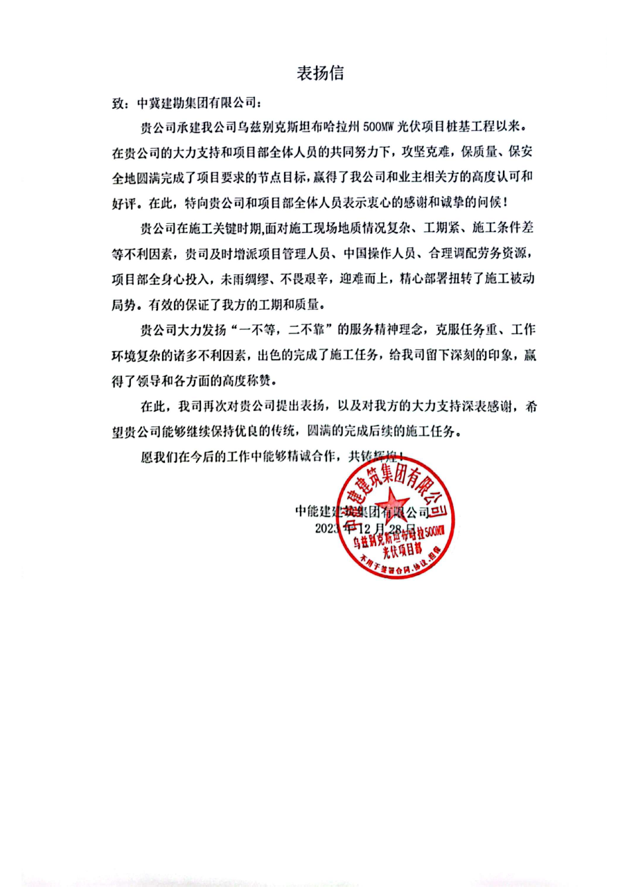 中能建建筑集團(tuán)有限公司發(fā)來(lái)的表?yè)P(yáng)信,對(duì)在烏茲別克斯坦布哈拉州500MW光伏項(xiàng)目建設(shè)過(guò)程中,項(xiàng)目部全體人員發(fā)揚(yáng)“一不等,二不靠”的服務(wù)理念,克服工作環(huán)境和地質(zhì)復(fù)雜等困難,在公司的大力支持和項(xiàng)目全體人員的共同努力下,圓滿完成了項(xiàng)目要求的節(jié)點(diǎn)目標(biāo),特向我公司表示衷心的感謝和誠(chéng)摯的問(wèn)候,愿今后繼續(xù)精誠(chéng)合作,共鑄輝煌。