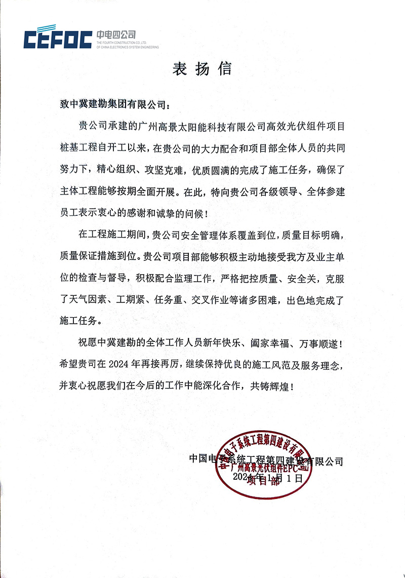 中國(guó)電子系統(tǒng)工程第四建設(shè)有限公司發(fā)來(lái)的表?yè)P(yáng)信,對(duì)我公司在廣州高景太陽(yáng)能科技有限公司高效光伏組件項(xiàng)目建設(shè)過(guò)程中,公司的大力配合和項(xiàng)目部全體人員的共同努力下,安全管理體系覆蓋到位,質(zhì)量保證措施到位,嚴(yán)格把控質(zhì)量、安全關(guān),出色完成了施工任務(wù),特向我公司各級(jí)領(lǐng)導(dǎo)、全體參建員工表示衷心的感謝,并授予“優(yōu)秀安全管理團(tuán)隊(duì)”和“優(yōu)秀資料包商”榮譽(yù)。