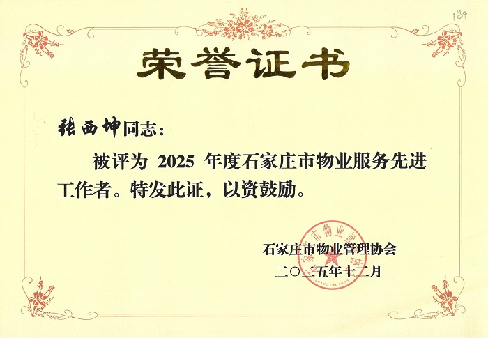 我集團所屬物業(yè)服務(wù)公司榮獲“2025年度石家莊市物業(yè)管理先進單位”,張西坤同志榮獲“2025年度石家莊市物業(yè)服務(wù)先進工作者”榮譽稱號。