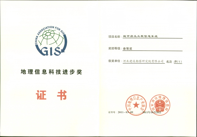 2011年10月25日,2011年度中國(guó)地理信息科技進(jìn)步獎(jiǎng)?lì)C獎(jiǎng)儀式在北京國(guó)際會(huì)議中心隆重舉行,經(jīng)中國(guó)地理信息產(chǎn)業(yè)協(xié)會(huì)、國(guó)家測(cè)繪地理信息局評(píng)選,我公司完成的項(xiàng)目《城市巖土工程信息系統(tǒng)》榮獲2011年度地理信息科技進(jìn)步三等獎(jiǎng)。